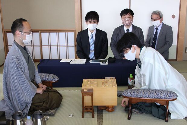 写真は2021年6月18日、ヒューリック杯棋聖戦第2局、昼食休憩明け。藤井聡太五冠が初めて、タイトル保持者として戦ったシリーズである。171手に及ぶ大熱戦を制した藤井棋聖が、第3局も勝って初防衛。その後のタイトル戦も勝ち続け、今年2月には五冠となる。